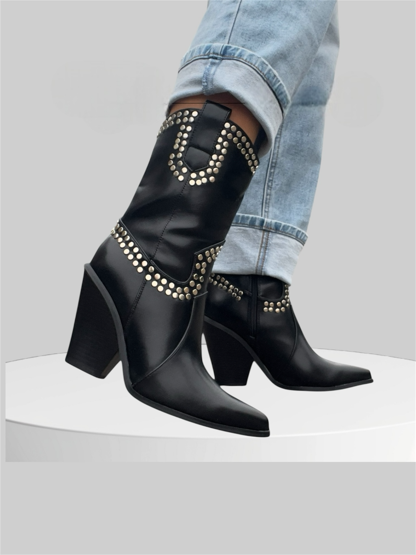 Botki o fasonie kowbojek to stylowy dodatek, który łączy klasyczną formę z nowoczesnymi akcentami. Zapinane na zamek błyskawiczny, co ułatwia ich zakładanie i zdejmowanie. Na cholewce zdobione są metalowymi nitami, które subtelnie podkreślają designerski look, dodając całości nieco rockowego, wyrazistego stylu. To idealny wybór dla osób, które cenią sobie modny wygląd z nutą oryginalności.