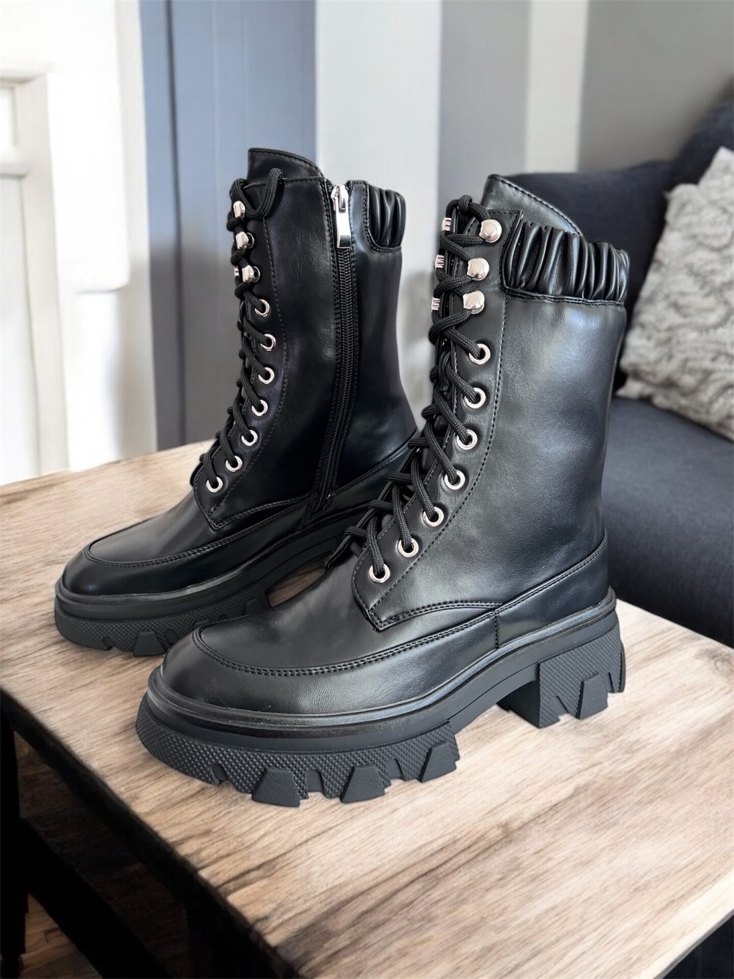 Czarne botki na grubszej podeszwie, łączące styl z wygodą. Wyposażone w sznurowanie oraz praktyczne zapięcie na zamek, co ułatwia ich zakładanie i dopasowanie. Dodatkowym atutem jest elastyczna wstawka w górnej części, która idealnie dopasowuje się do kształtu łydki, zapewniając komfort podczas noszenia. To nowoczesne i funkcjonalne obuwie doskonale sprawdzi się zarówno w codziennych stylizacjach, jak i w bardziej casualowych zestawach.